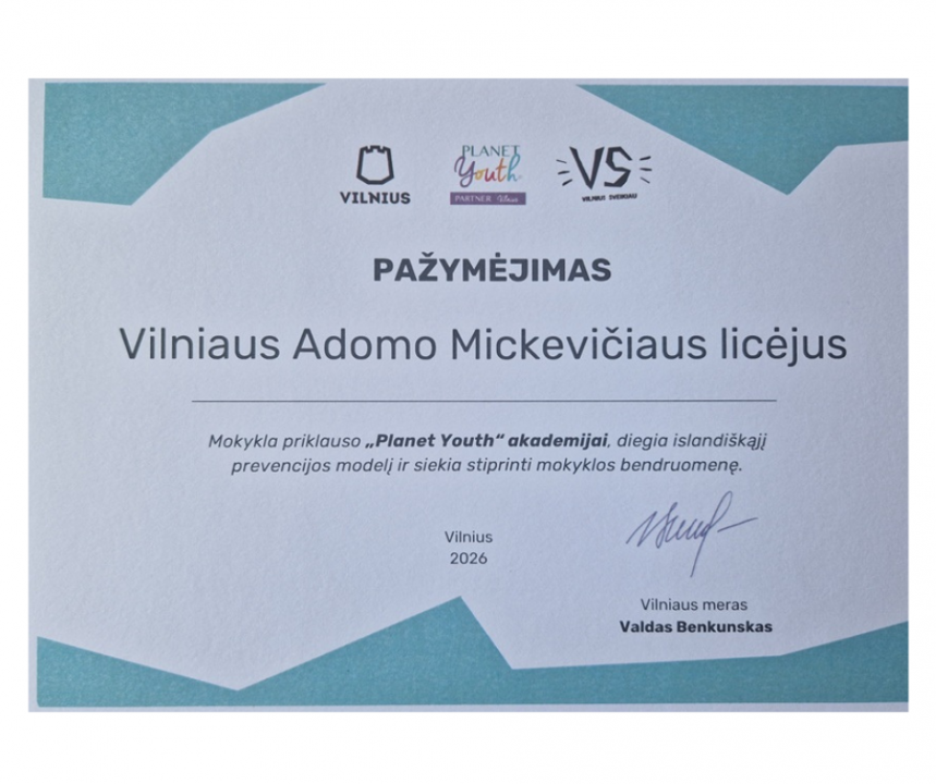 Kovo 10 dieną Vilniaus miesto savivaldybėje "Planet Youth akademija" iniciatyvoje dalyvaujančioms mokykloms oficialiai įteikti pažymėjimai.