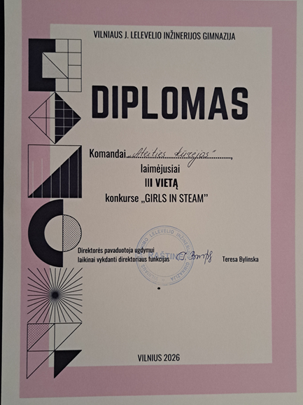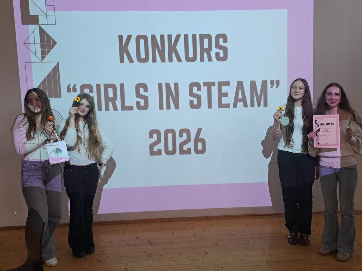 Balandžio 17 dieną 8 a klasės komanda ,,Ateities kūrėjos'' - Paulina G., Iveta L., Izabela S. ir Eliza R.- sėkmingai pasirodė konkurse ,,Girls in STEAM", vykusiame Vilniaus Joachimo Lelevelio inžinerijos gimnazijoje. Renginio tikslas – skatinti merginų domėjimąsi gamtos mokslais, technologijomis, inžinerija, menu ir matematika. Renginyje rungėsi komandos iš šešių Vilniaus mokyklų. Mūsų ,,Ateities kūrėjos" pelnė garbingą III vietą. Nuoširdžiai sveikiname ir linkime drąsiai siekti naujų pergalių!