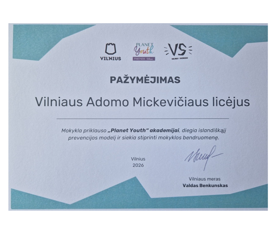 Dzięki wsparciu Samorządu m. Wilna, Biura Zdrowia Publicznego i innych specjalistów, społeczność szkolna będzie dążyć do poprawy samopoczucia uczniów i ograniczenia używania substancji psychoaktywnych, wzmacniania roli rodziców i relacji między wszystkimi członkami społeczności.